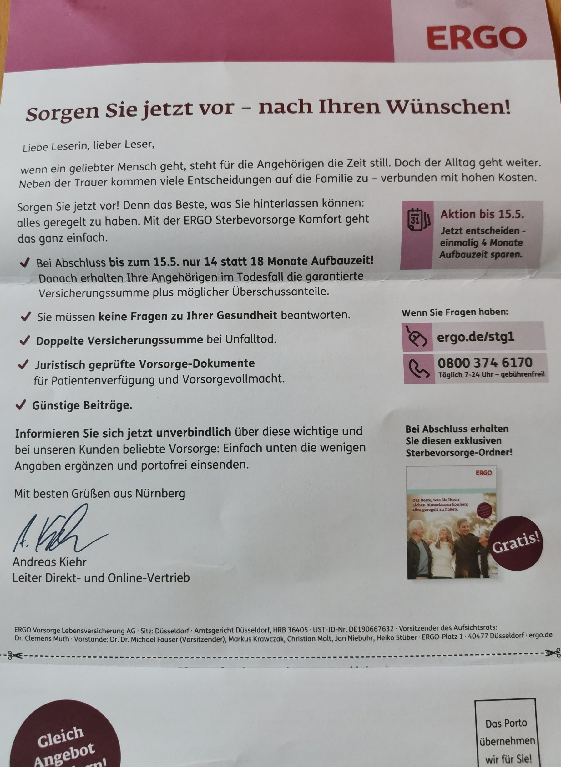Dieser Tage ist mir ein schicker Flyer der ERGO in die Hände geflattert. Es geht um Sterbegeld-Versicherungen. Ganz schnell und einfach abschließen und die Hinterbliebenen entlasten. Klingt doch gut?