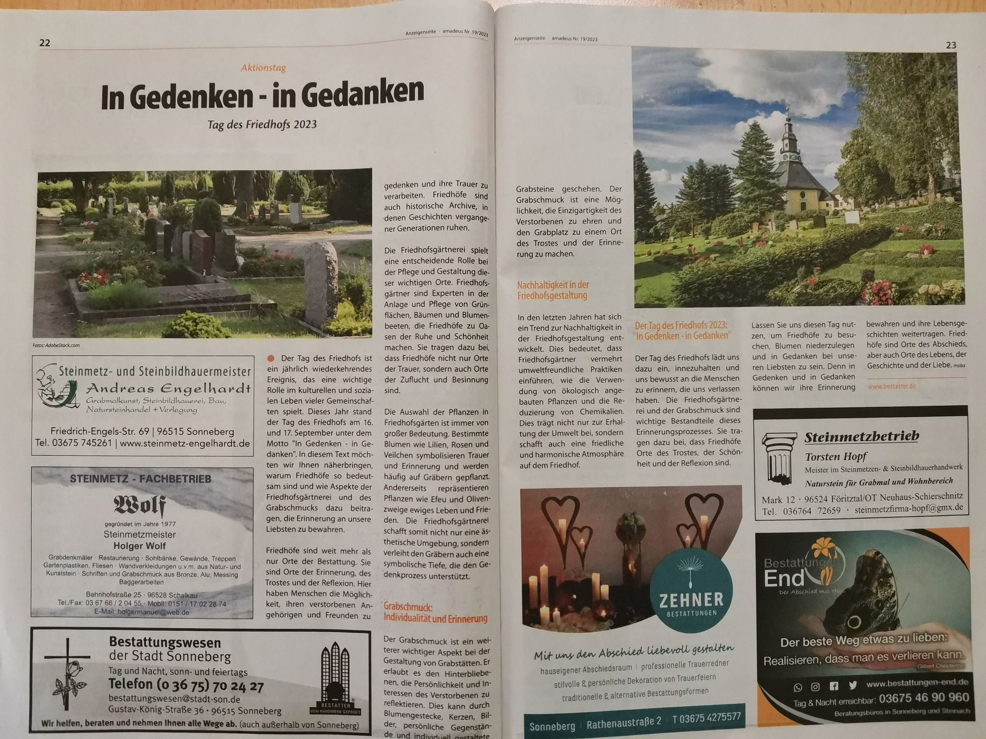 Heute ist mir eine Ausgabe von "amadeus" ins Haus geflattert. "Das Anzeigenmagazin" im Landkreis Sonneberg. Auf der Seite 22 geht es um den "Tag des Friedhofs". Der 17.9. ist ein Datum, zu dem es an manchen Orten auch Veranstaltungen gibt. Hier sollten Sie sich als Bestatter unbedingt beteiligen.