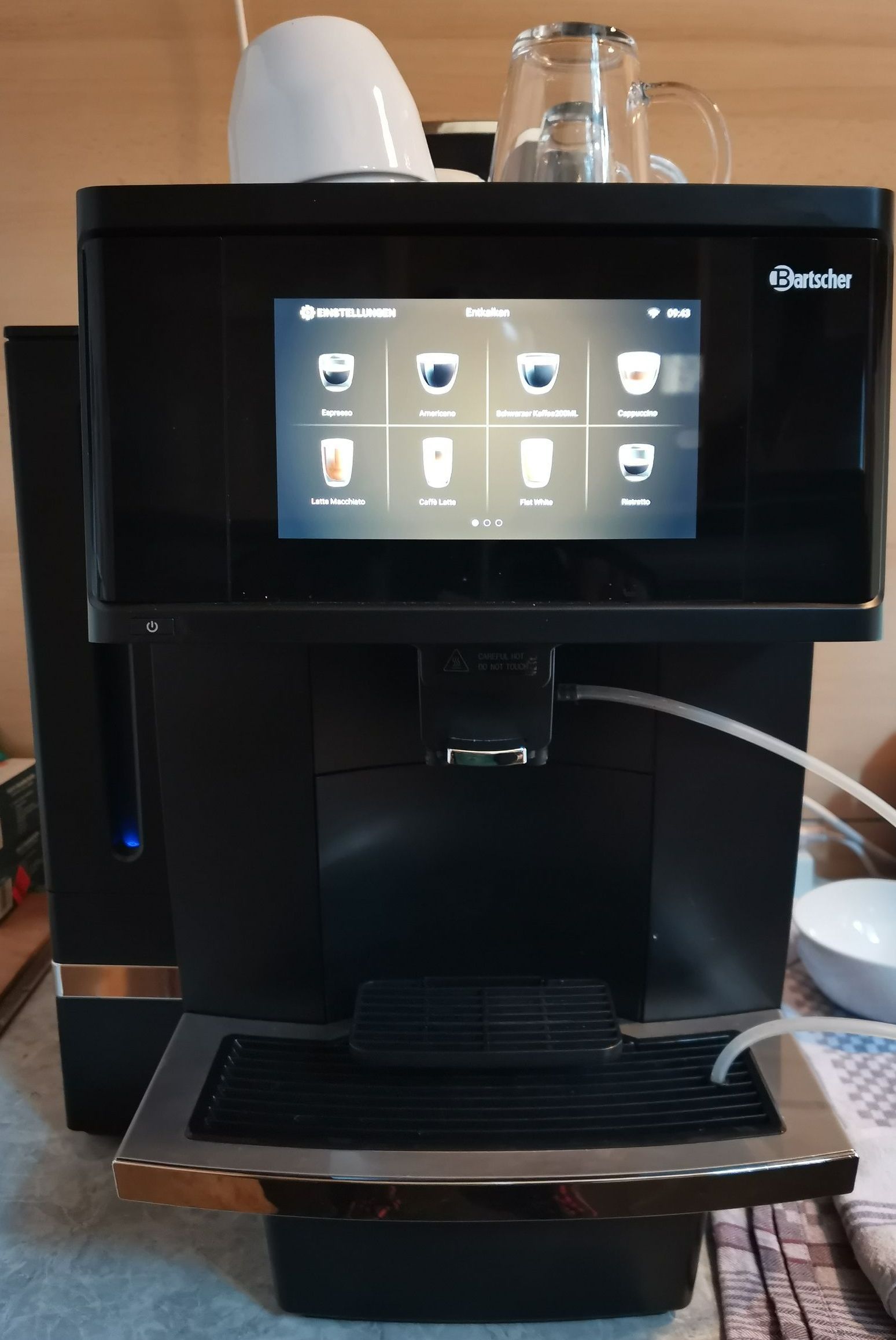 Etwas eleganter lässt sich der Kaffeegenus für den Kunden mit einer solchen Maschine erzeugen. Da gibt es viele verschiedene Varianten und zudem auch gleich noch heißes Tee-Wasser, für alle, die keinen Kaffee trinken.