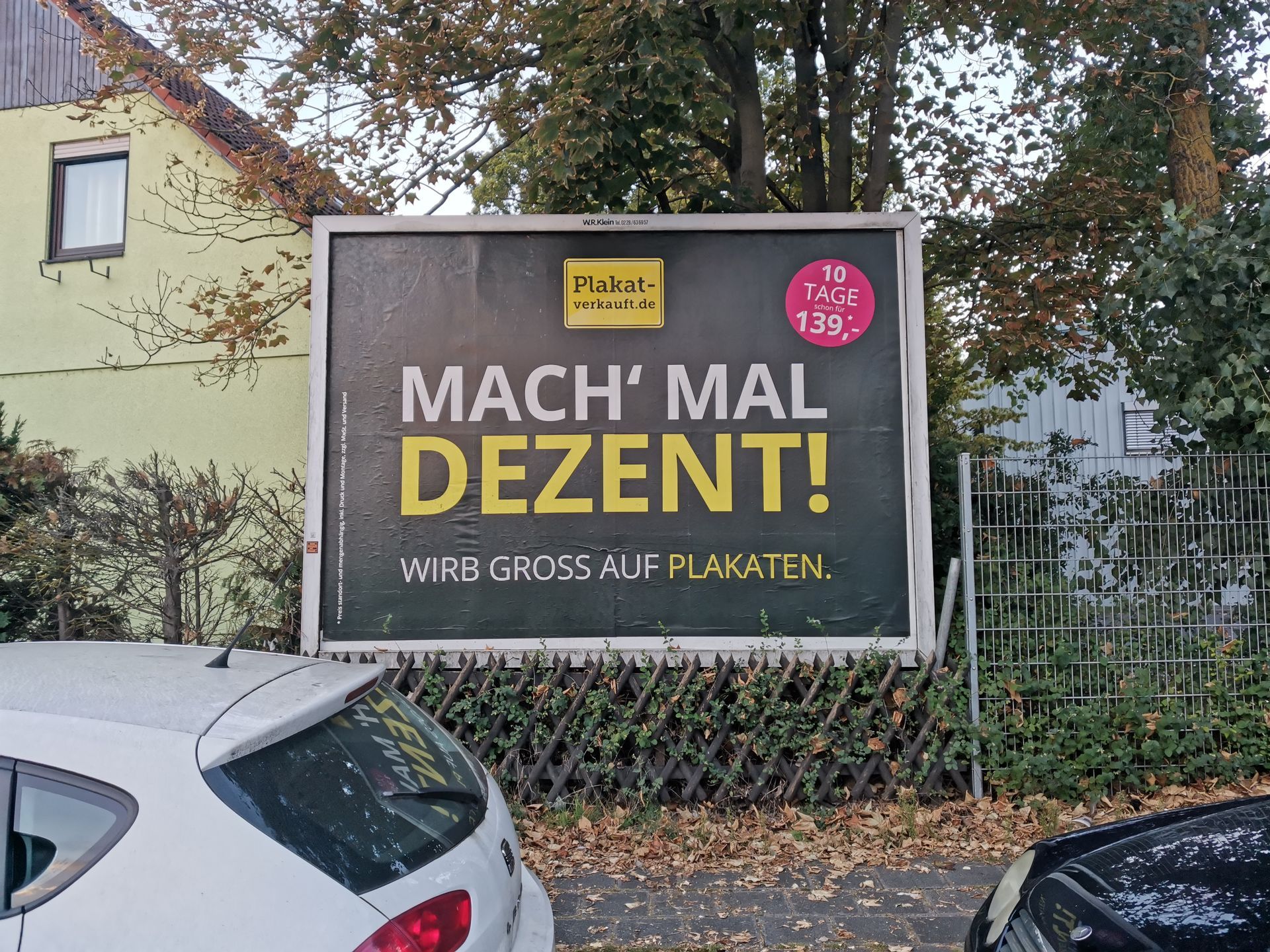Ich möchte Ihnen heute Mut zu und Lust auf Großflächenplakate machen. Zusammen mit den Druckkosten pro Stück dürften diese für 10 Tage in etwa den gleichen Preis haben, wie eine Obligatorische. Der entscheidende Vorteil liegt jedoch darin, dass sie nicht nur an dem einen Samstag zu sehen ist, sondern an ganzen zehn Tagen. Das lässt den Preis dann doch ganz anders aussehen.