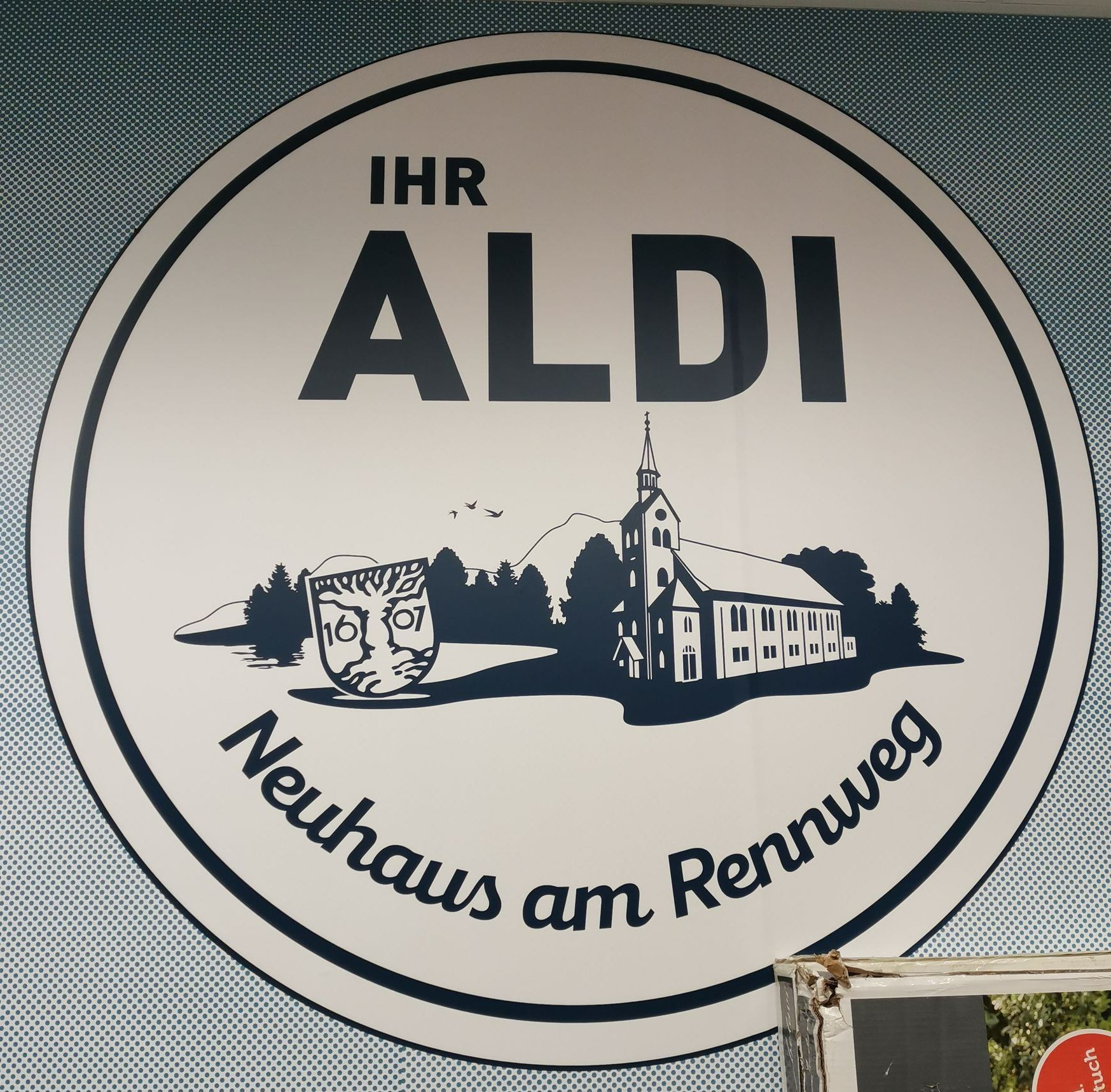 Bei den Mitbewerbern steht das etwas von "Liebe und Lebensmitteln" oder der Name des Discounters mit "Frische" oder "günstig" kombiniert. Bei Aldi in Neuhaus am Rennweg kann man dieses ausgesprochen wirklich sehr gelungene Motiv sehen. Es zeigt das Wahrzeichen der Stadt, die Holzkirche, das Stadtwappen und die bergige Landschaft um Neuhaus herum (Neuhaus liegt quasi auf dem Berg). Ich habe dieses Schild am vergangenen Samstag gesehen und war einfach begeistert.